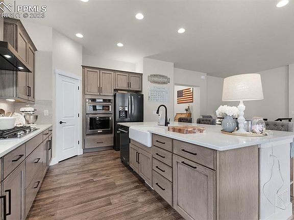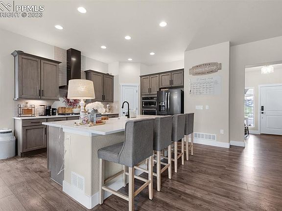 This exquisite ranch-style home in Monument’s Forest Lakes community offers luxury and breathtaking 180 degrees unobstructed mountain views. Relish the stunning views of Mt. Herman, the valleys, roars of the Thunderbirds from the AFA, & perfect stargazing at twinkling nighttime skies! Primer corner lot where no neighbors will ever be behind, and award-winning D38 schools! Inside, find a grand open layout with exceptional upgrades throughout, incredible natural light, & views from every room! Home chefs will love the gourmet kitchen bursting with brilliant morning sun and boasting plenty of custom cabinets, sleek quartz countertops, farmhouse sink, walk-in pantry for all your kitchen essentials, high-end KitchenAid appliances including a 5-burner gas cooktop, & an expansive center eat-in island. The living room is anchored by a cozy corner gas-burning fireplace with floor-to-ceiling stone surround, and offers a sliding door to the serene oversized backyard ready for summertime outdoor living! Main-level primary retreat boasts two walls of window to let in great natural light and killer mountain views, a glass door to the backyard, and a spa-inspired en-suite featuring a luxurious walk-in shower with rock pebble flooring, bench seat, and dual showerheads! Additional main-level bedroom great for guests or a home office. Fully finished junior suite basement with high ceilings. Here, find a family room that’s perfect for entertaining, and 3 additional bedrooms with nearby bath! All cabinetry matches throughout giving the home a gorgeous uniformed look! Incredible backyard with brand new extensive water-efficient landscaping. Oversized 3-car garage with finished flooring! Located only minutes to Mt. Herman trailhead and the Forest Lakes community where over 450 acres of open space, neighborhood parks, & trails that connect all throughout the area await. Only 10 minutes to shopping, groceries, and I-25! This 100% turn-key home needs nothing for you to do but move right in!