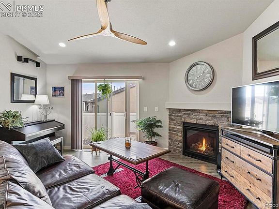 This home has it all! Awesome patio home with full basement boasts a popular open concept floor plan with main level living. This home features 4 bedrooms, 2-1/2 baths and a fully finished 2 car garage. Wood laminate flooring graces the open main level living area - great room, dining area and kitchen. A gas fireplace with beautiful stone surround is the focal point of the generous great room which grants access to the back patio through a sliding door. The great room flows into the bright dining nook with a dream kitchen adjacent. The cook will enjoy all of the kitchen appointments, to include maple cabinets with lighting above and below; granite counters with breakfast bar; undermount kitchen sink; all SS appliances with gas range and huge pantry. (NOTE: Seller will replace the current kitchen refrigerator with another SS refrigerator.) The main level master suite features a luxurious bath with a granite-topped double vanity, large walk-in shower with seat and mudset tile floor plus a roomy walk-in closet. Bedroom 2 on the main is currently used as an office and is non-conforming, as there is no closet. A powder room and laundry area complete the main level. The fully finished basement offers a spacious family room with a fabulous wet bar, recessed lighting and entry to bedroom 3 through wide double doors. Bedroom 4, a full bath and a large storage room complete the basement level. This home comes with a smart home thermostat and myQ smart garage door opener. Enjoy the Colorado weather while relaxing or grilling on the back patio surrounded by a privacy fence. You can also venture over to the wonderful community green space highlighted by a pretty gazebo. This home is in exceptionally good condition and it's located in a desirable area near bases, shopping and schools. See it today as it won't last long!
