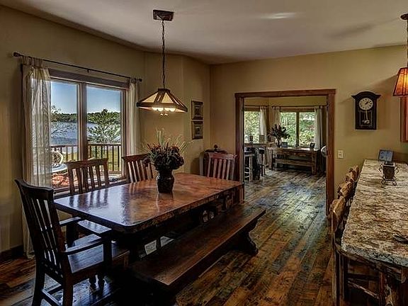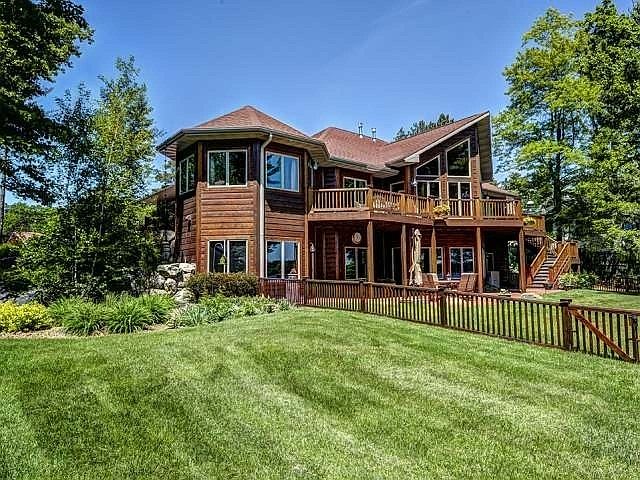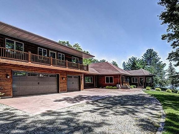 In a Class of it's own, be amazed by this magnificent manor. This unique lake estate is located on Lake George with 130' of sand frontage, 1.62 acres professionally landscaped with a view that will take you breath away. This 3BR, 3BA home comprises 3600 sgft of superb craftsmanship, character and exclusive furnishings from around the world. This property includes a 2 bedroom 1 bathroom executive guest suite above the 3 car detached garage with Portico. The home boasts a gourmet kitchen with a copper farmhouse sink, built-in double oven, granite countertops, and cherry cabinetry. The master suite offers a walk-in, tiled shower and soaking tub. The distinctive wood flooring was reclaimed from a Superior grainery. The walkout lower level features unique, heated, acid stained concrete floor, a hot tub room (hot tub included), an endless great room, and a wet bar. Included with home is a blackjack table, pool/ping pong table with robotic return, ski boat, pier and pole barn for storage.