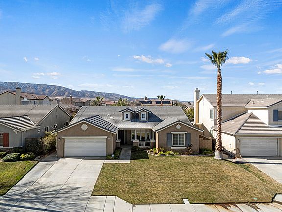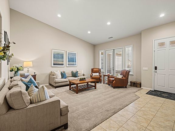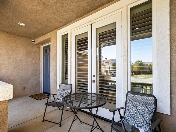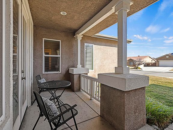 Don't miss this beautifully maintained single-story Lennar home featuring 4 bedrooms + bonus room, 3 bathrooms, a sparkling pool + spa, plus FULLY OWNED 25 PANEL SOLAR SYSTEM! The inviting front yard and cozy sitting porch welcome you to this bright open floor plan, where the living room flows into a versatile den—perfect for a home office. The family room boasts a warm fireplace and custom built-ins, creating the perfect space to relax. The spacious kitchen is ideal for entertaining, featuring granite countertops, a center island with seating, a built-in range, stainless steel appliances, under-cabinet lighting, and views of the backyard and pool through the sliding glass door. Retreat to the primary suite with plantation shutters, backyard access, a walk-in closet, plus an ensuite bathroom with dual vanities, a walk-in shower, and a soaking jet tub. Three additional bedrooms offer space and closet storage, with access to a stylish bathroom featuring dual vanities and granite countertops. Step outside to your private backyard oasis with a covered open-beam patio, lush grassy area, and a sparkling pool + spa—perfect for relaxing or entertaining! This home has been meticulously maintained and prepared for desert living, showing true pride of ownership with all the comfort you crave!