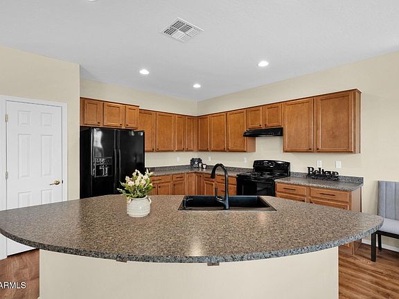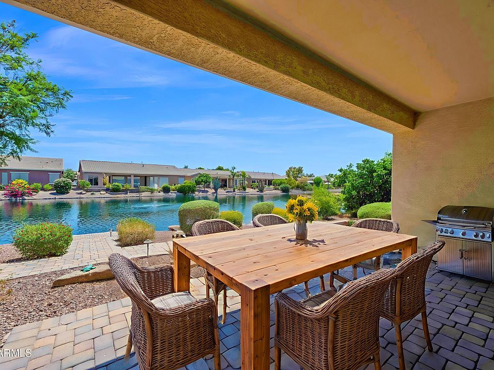 Tranquil waterfront living for the best years of your life! Welcome to resort-style living in the guard-gated Province at Maricopa active adult community. This lovely home offers a split floorplan with 2 spacious bedrooms, a versatile den, and 2 bathrooms, all designed with functionality in mind. Upon entry, you're greeted by a freshly painted exterior, easy maintenance landscaping, and an inviting pavered courtyard. Step inside to find a light and bright open concept layout featuring an abundance of windows with waterfront views, designer paint, newer laminate wood flooring throughout the entire home, new window coverings, and ceiling fans with lights in every room. The kitchen offers a large island and breakfast bar, maple cabinets, pull out shelves, upgraded hardware, black appliances, and plenty of counter space. What makes this home truly exceptional is its coveted waterfront lot! Imagine enjoying your morning coffee or hosting sunset gatherings with friends, all while taking in serene views from the covered patio or the expansive pavered seating area. Plus, there are 4 citrus trees (2 lemon, 1 orange, 1 grapefruit) for your enjoyment. With a new HVAC system in 2023, a new water softener in 2020, and FURNISHINGS INCLUDED, this home is turnkey and ready for you!
