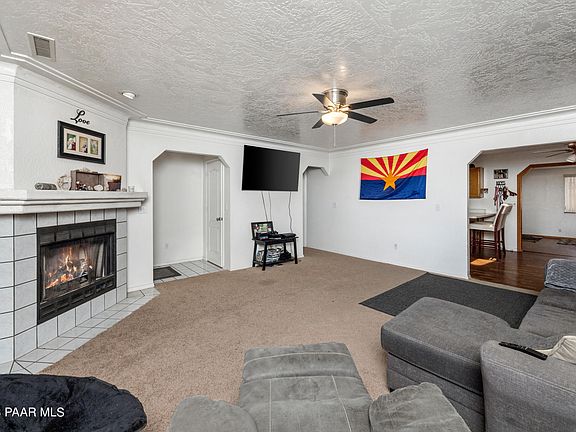 Great family starter home located in the desirable Superstition Hills of Prescott Valley. 3 bedroom, 2 full baths, 2 car garage, fully fenced backyard with RV gate and dog run or garden area - great for the kids! Covered patio, large shed. Large living room with crown moulding and gas fireplace. Spacious kitchen and laundry room with storage cabinets and desk. Permitted sun or playroom. 2 car garage. Motivated Sellers.