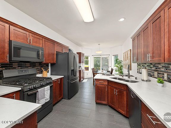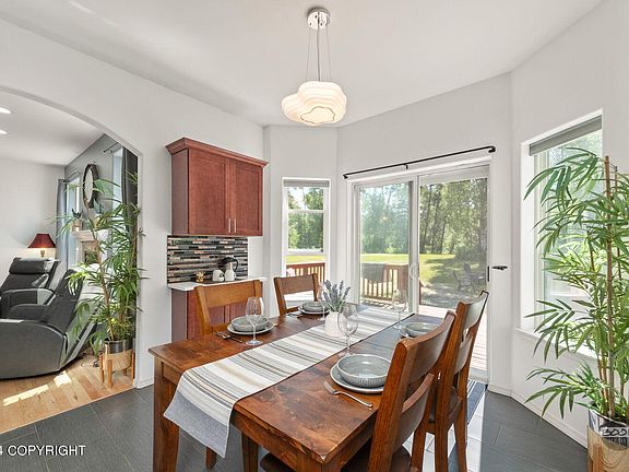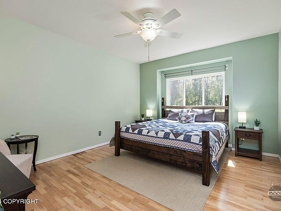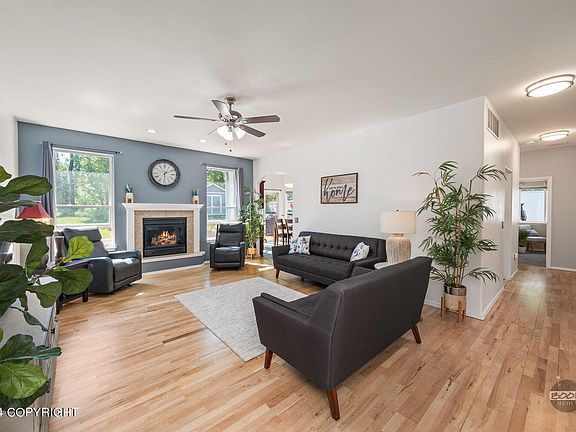 Gorgeous home in Woodfield Park. Meticulously maintained home w/split floor plan & master en-suite & large 3 car garage. Open bonus room-use as formal dining or office. Lots of windows w/wonderful southern exposure letting natural light fill the home. Updated bathrooms and kitchen 2021. Real wood floors in living area, new carpet in bedrooms. Lovely entry way w/entry closet. Gas fireplace.The large backyard w/fire pit. Close to Wasilla but very private and quiet. Home backs to state land. Fully fenced back yard w/driving access for all your toys and RVs.