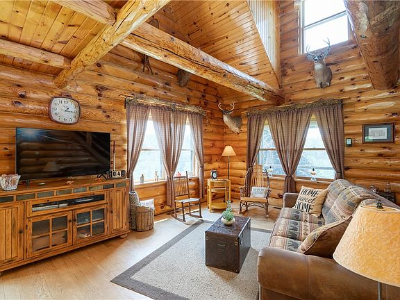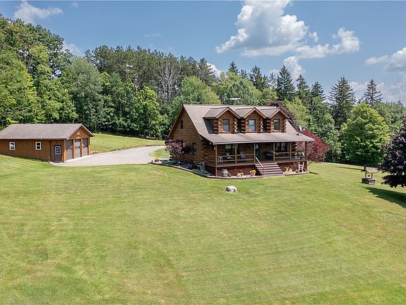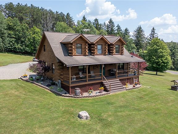 BACK ON MARKET~ BUYER HAD COLD FEET !! Introducing a picturesque log cabin home for sale that offers the perfect blend of rustic charm and modern convenience, situated on a sprawling 4.15 acre parcel of land. The exterior exudes timeless appeal with its handcrafted logs, expansive front porch and windows that frame breathtaking views. Step inside to discover a thoughtfully designed floor plan that seamlessly combines the allure of log cabin living with first-floor living. The main level boasts an open floor plan with a spacious living area, kitchen and dining, fit perfectly for entertaining. A huge sized master suite on the main level complete with an en-suite bathroom & large closet. 3 bedrooms and a bathroom on the upper level offer ample space for guests or family members. As you explore the exterior, you'll discover a barn and a 3 car garage providing abundant storage space for vehicles, equipment or hobbies. Enjoy the peace and privacy of country living with easy access to modern amenities. Don't miss your chance to experience the rustic beauty and endless possibilities this home has to offer! DELAYED SHOWINGS UNTIL OPEN HOUSE JULY 16 & DELAYED NEGOTIATIONS DUE JULY 21 @ 5.