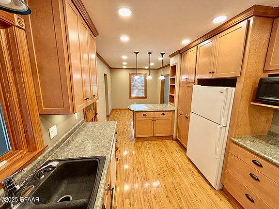 Charming 4-bedroom, 2-bath home - Updated & move-in ready! This 4-bedroom, 2-bath home blends character with modern convenience. Built in 1920, the home features numerous updates including siding, roof, paint, flooring, and a renovated kitchen with warm maple cabinets. Enjoy two spacious bathrooms-one with direct access from the primary bedroom. The backyard offers a large private backyard with firepit and pergola, sprinkler system, alley access. Additional highlights include an attached heated one-stall garage and great curb appeal. Located in a quiet small town with an easy commute to Grand Forks, this property offers the best of both worlds: peaceful with city convenience nearby.