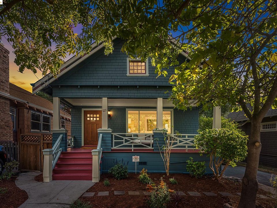 Fulfill your East Bay lifestyle aspirations in this lively Temescal area gem. This vibrant bungalow blends classic craftsmanship with modern flair. Its inviting front porch is perfect for waving to your neighbors and beckoning friends to stop by. Craftsman details add ambiance while showcasing a rich history. The living room features an original brick fireplace, flanked by built-in bookshelves. Beamed ceilings and hardwood floors elevate the elegance. The large dining room is a standout with designer appeal. The elegant china cabinetry, wainscoting, plate rails, beam ceilings, and wallpaper frieze combine style with functionality. The original pocket door gives the room added privacy. The room’s generous proportions ensure that it can accommodate a crowd. The spacious kitchen leads through a proper light-soaked mudroom that connects you to the backyard. The yard is a private oasis, complete with raised vegetable beds and flourishing fruit trees. This tranquil outdoor space offers a perfect blank canvas for gardening enthusiasts. Bungalow details are best when framed in full color. The color palette throughout features soothing tones of blue sage and teal. These bespoke hues enhance the bungalow's character, creating an atmosphere that is both tranquil and stylish.