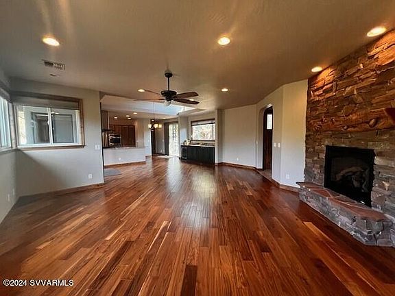 Exceptional quality built home dripping with rich details inside and out making this a drop dead beautiful turn key wonder. Located in the heart of West Sedona at the end of a cul-de-sac boasting privacy, this custom built home offers wood beamed ceilings, wood floors, split floor plan with primary ensuite on one of the home and a separate 2 bedroom with kitchenette and 3/4 bath on the other side making it a perfect in-law suite or potential short term rental, Front rusted iron gate opens into a large paver patio, dining room opens onto a covered patio with a firepit and flower boxes and overlooking a wash with extra privacy. 3 Car heated and cooled garage, plus an additional room off of garage is perfect for a work out room or office. Full RV Hook up, separate parking for additional guests makes this diamond a sparkling jewel.