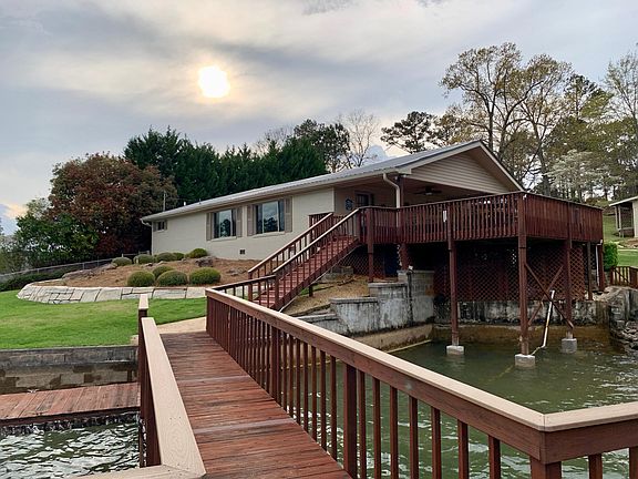 BIG HUGE DEEP WATER AS FAR AS THE EYE CAN SEE! Incredible one level fully furnished brick lake home on some of the most beautiful water on Lake Martin. Looks out towards Woods Island and Young's Island in the convenient Bay Pine Island area. Just one big cove over from Bay Pine Marina (fuel, pizza, snacks, drinks). You can also glimpse the peak of the Smith Mountain Fire Tower from this home's big decks. Covered boathouse with boatlift. Long Dock. Floating dock. Seawall. Big workshop. HUGE, quiet master bedroom with big walk in closet. Open concept greatroom with pretty kitchen, dining with bar, expansive living area with lake views to die for! Over 2000 square feet of lovely Lake Martin living. Situated on a peninsula. Sunrises in the front and sunsets in the back.