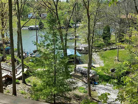 Williamstown Lakefront Home, 11 Year Old Ranch nestled on 3 wooded lots, Covered Dock includes to 2 Boat lifts, Double Covered Decks, 3 Bedrooms, 3 Full Bathrooms, Large Equipted Kitchen with Counter Bar, Stone Fireplace, 1 Car garage, Carport, Plenty of Parking area, Step Free into Home, Access Drive to water, Wood Shed for storage, Woodburning Fire pit, House Fully Furnished Ready to Move In!