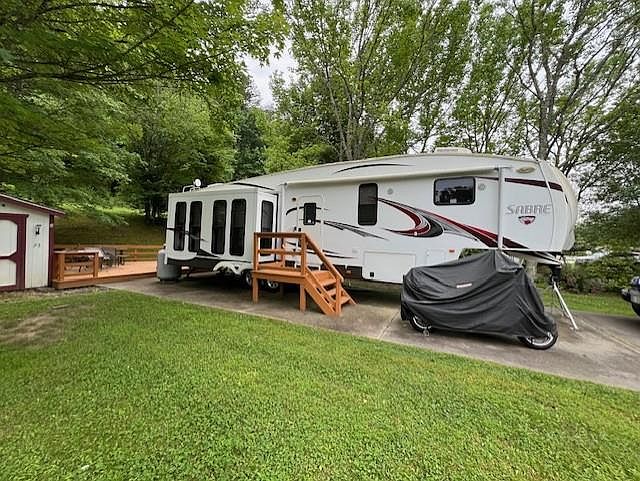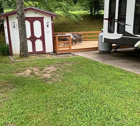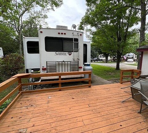 Here is your chance to own a piece of paradise in a beautiful RV park with swimming pool, clubhouse, laundry facility and beautiful grounds! 2012 Forest River Sabre, 34' length offers spacious living area and kitchen and a full bath, bedroom with plenty of storage space. Complete with shaded lot, this property features an 8x10 storage building with electricity and a large deck. The lot backs up to pasture/woods for privacy. Great location, convenient to mountains of Blairsville, Blue Ridge, Murphy, NC (casino), shopping, restaurants, several golf courses, doctors and hospitals. Visit website for neighborhood information at https://arrowheadvalleyresort.com/