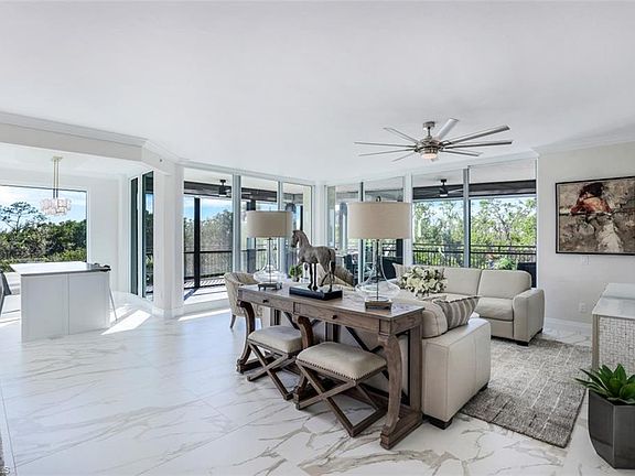 Completely renovated and stunning, A corner unit with a private outdoor wraparound terrace and a screened lanai unique to this level only. Impeccably renovated with all new plumbing, electrical, LED lighting, fans, chandeliers, plantation shutters, lanai screens, Italian porcelain plank tile throughout the interior, outdoor tile in lanai and balconies, solid wood interior and closet doors, custom closet cabinets, paint and much more. A beautiful new kitchen with solid wood custom cabinets, quartz countertops, under-cabinet lighting, a wine cooler, LG stainless appliances and a wet bar. All three baths are beautifully renovated with wood cabinetry, quartz countertops, and much more. Boasting 2,400-plus square feet of living space with an open floor plan and panoramic views of the outdoors from the moment you enter. Optional transferable membership to Tarpon Cove Yacht & Racquet Club that includes access by private shuttle to Delnor-Wiggins Pass State Park beach, tennis and pickleball, resort-style pool, fitness center, tiki bar and restaurant. Boat slips are available for lease or purchase at marina. Coming soon Kinsale Golf Club, an independent 18-hole golf course across the way.