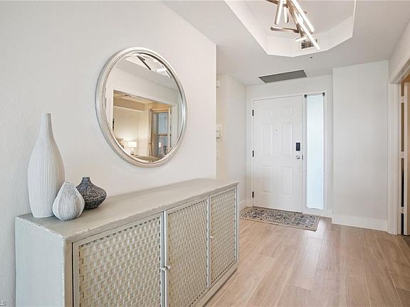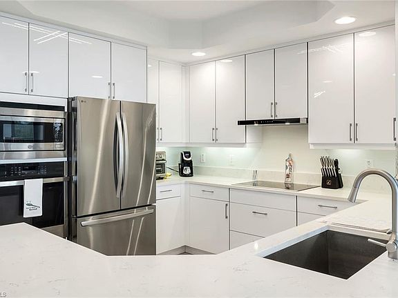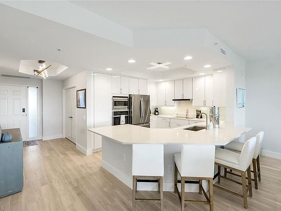Welcome to Caribe at Cove Towers! A gated luxury high-rise community perfectly positioned along the tranquil Wiggins Bay in North Naples. This move-in-ready 3-bedroom, 2-bath residence blends timeless style with modern comfort, featuring a spacious open-concept layout. Features include new, wood-like plank tile flooring, tray ceilings, recessed lighting, and upgraded electrical and plumbing fixtures throughout. The newly renovated kitchen is designed for both beauty and function, showcasing brand-new quartz countertops, brand-new stainless-steel GE built-in wall microwave & oven, new LG refrigerator & dishwasher, and a brand-new, sleek induction cooktop & hood. The utilities room includes brand-new LG, ThinQ Washer & Dryer. The primary bedroom has new custom closets by Closets by Design. Enjoy peace of mind with impact-resistant windows and electric storm shutters, along with garage parking and a private storage locker. Cove Towers is located in North Naples just minutes from Mercato, Waterside Shops, & The Pavilion. Residents at Cove Towers enjoy access to resort-style amenities, including a community pool, clubhouse, fitness center, tennis courts, EV charging, marina access, on-site dining, and private beach access. Optional Tarpon Cove Club membership provides even more opportunities to embrace the Naples lifestyle — with a private boat shuttle to the beach, social activities, and waterfront dining. Come experience the perfect blend of luxury, comfort, and coastal charm at Caribe in Cove Towers — your slice of paradise in Naples awaits!