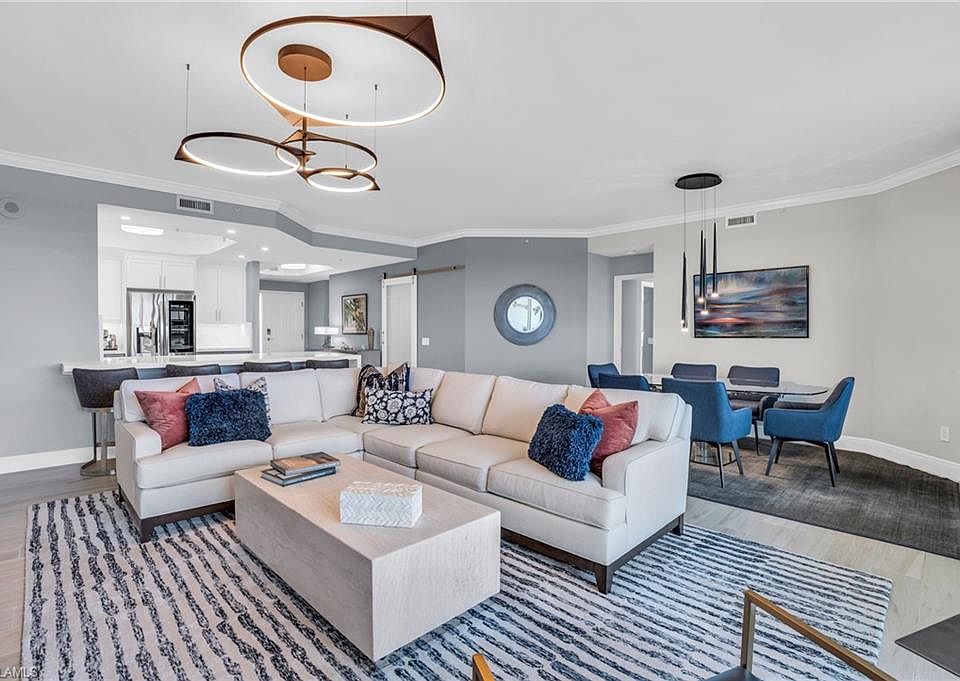 Welcome to Caribe at Cove Towers. Wait until you see this 6th floor view. Encompassed in this open floor plan is 3 bedrooms, 2 full baths including an en-suite spa like bath and dual closets in the primary bedroom with views of the gulf and lanai access. Living in Naples is all about the lifestyle and this property showcases that at a high level. As you step inside to this fully renovated condo, the breathtaking views and elegant design immediately draws you in. The open floor plan seamlessly integrates the living, dining and kitchen areas creating a harmonious flow and casual sense of sophistication and comfort. The chef’s kitchen features a wine cooler, spacious eat-in peninsula with quartz countertops enhanced with under cabinet and overhead lighting. The expansive, comfortably furnished lanai with electric storm shutters is perfect for relaxing and savoring the stunning Gulf sunsets during the winter months. There is plenty of room for guests in the secondary bedrooms, with one currently serving as a study and another renovated full bath in the hallway. Spacious enough for year round living and could also serve as the perfect second home to just turn the key with nothing to worry about while you are out of town. Included is a membership to the Tarpon Cove Yacht and Racquet Club. A place to unwind, socialize, dine and play. Members can access one of Naples finest beaches without the hassle of parking directly from the dock at the Club, aboard the Endless Summer. Begin living the good life in Naples today.