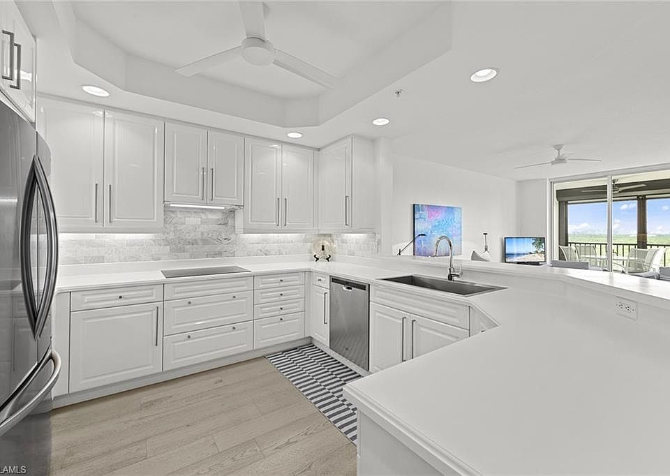 The most luxurious feeling unit available with a view in Cove Towers. Improvements galore including new 8" wide plank naturally aged Medallion Collection Hardwood flooring in living area, new carpet in bedrooms 2015, new Master bath 2020 with frameless shower door, 12 x 24 Porcelain tile, Quartz countertops, Hansgrohe single lever Lav faucets, new guest bathroom 2015 with marble countertop, sink, faucet, toilet and hardware, new Hinkley, Hunter and Minko Aire lighting and ceiling fans, new LG French door refidgerator 2019 with new induction cooktop, Whirlpool convection oven, microwave and dishwasher, Marble subway tile backsplash, sink, faucet and hardware 2015, 2014 Samsung clothes dryer and 2020 Samsung clothes washer, new York AC 2017, new Rheem hot water heater 2014, extra flooring, carpet and tile, Electric Hurricane shutters serviced regularly by Shutter Doctor of Naples. Storage unit is located right next to parking spot, so very convenient. This unit has been pristinely cared for, clean, light and bright with all the current popular colors and gorgeous views, day or night of the Gulf of Mexico , watch the boats come in on Wiggins Pass Inlet and sunsets galore!