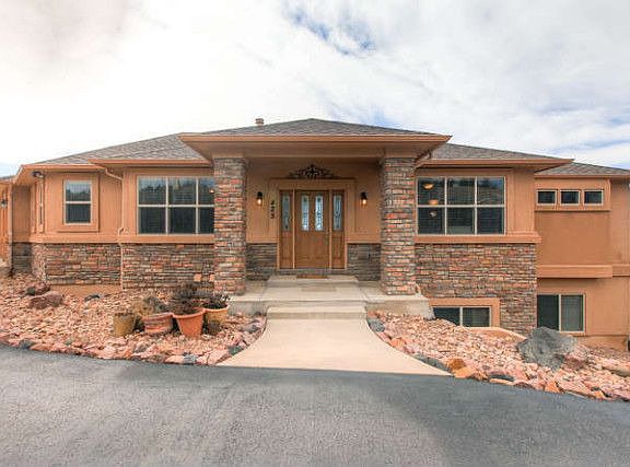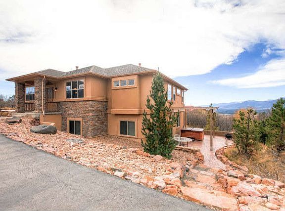 Monument Beauty with Amazing Views! Quality-built stucco & stone home located in quiet neighborhood cul-de-sac. Upgraded home with the rare combination of privacy and sweeping front-range views that everyone desires. Main-level living with open floorplan and a wall of windows to admire those views. Roomy living room features stacked stone fireplace. Gourmet kitchen features stainless appliances, wall oven, granite counters, island with serving bar and hardwood floors. Desirable D38 schools! Generous Trex deck across full length of the house. Master retreat has walk-out to deck and private 5 piece bath with soaking tub and generous walk-in closet. Main level study could also be a 5th bedroom. Lower level walks out to custom stamped concrete patio and hot tub with pergola. Each of the 3 oversized lower level bedrooms has an attached bath and walk-in closet. Family room is perfect for watching movies and playing pool. Nearly 3/4 acre beautifully landscaped lot with lots of rock work, backyard lawn and healthy hedge of scrub oak for privacy! Dual furnaces and water heaters. Fully wired for internet and cable/dish. Basement stubbed for wet bar.