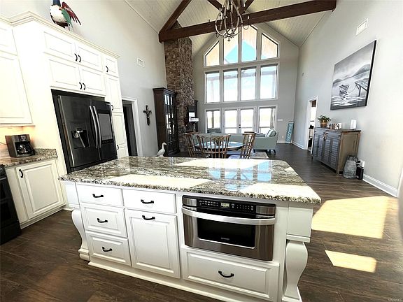 GORGEOUS LAKEFRONT HOME!! Whether you are looking for your forever home or a weekend getaway, this home has it all. 24ft vaulted ceilings with floor to ceiling windows that accentuate the spectacular Lake Jordan sunsets, 195ft of gently sloping waterfront with a sandy beach perfect for placing your toes, a 2 lift boathouse, and tons of entertaining space make this home the perfect lake property. The main story offers a open concept living space with gorgeous kitchen - stainless appliances, large island , granite counters . Main floor also offers 3 large bedrooms with walk in closets, 3 bathrooms, and a laundry room. This home also offers a completely finished walk out basement with 9 ft ceilings, 2 bedrooms, 2 bathrooms, a gym (or additional bedroom) a large game room/bar, and additional living/media room. The basement level has beautiful stained concrete floors that are perfect for wet feet coming out of the lake. In addition, there is a large, certified storm shelter/room is also great for additional storage. If you are looking for a stunning property on beautiful Lake Jordan, this is a must-see!