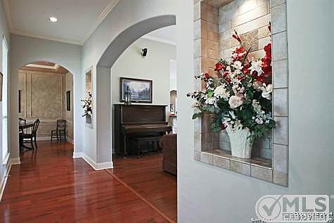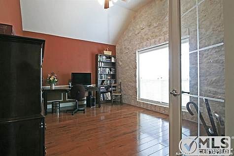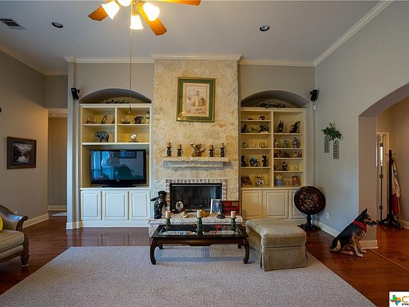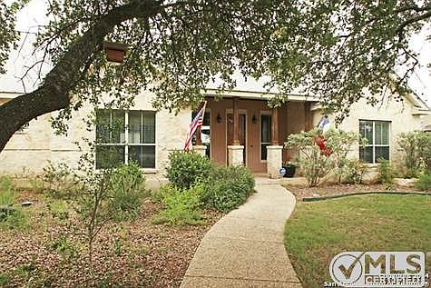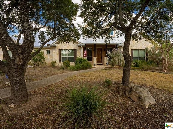 Single story former model home in Mystic Shores at a great price! 2779 square feet on 2 acres with a 3 car garage, wood floors, rock fireplace with built ins, oversized bedrooms, home office, custom cabinetry, metal roof and formal dining. Master bedroom has a 10x10 sitting room for nursery or gym! A guest home can be added on if desired and corner lot gives you plenty of options. Walk to amenity center with fitness equipment too! Back porch does have a peak a boo lake and hill country view