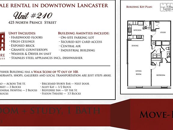 *FLOOR PLANS MAY VARY BUT FINISHES ARE SIMILAR* Call this upscale loft style 1 bedroom + study your home! This apartment boasts high ceilings, exposed brick and duct work, and original columns and beams for an industrial feel. Premium finishes include stainless steel appliances, full overlay shaker style cabinetry throughout the unit, unique light fixtures, and hardwood and ceramic tile flooring. An open floor plan and large windows flood natural light throughout the space. Spa like bathrooms include tiled showers with frame-less glass doors. Closet space is plentiful and the apartment comes with a washer and dryer for your ultimate convenience. Impossible to find off-street parking is also included with your unit! When you're not hanging out in your light-filled unit, venture outside into the heart of downtown Lancaster. With a walk-ability rating of 97% you are across the street from several of Lancaster's finest restaurants, cafes, and shops. There is no better location in Lancaster City - blocks from Central Market, bustling nightlife, the Fulton Theater, Lancaster General Hospital, and Franklin & Marshall College. Get out of town via Lancaster's Amtrak station (within walking distance) and head to Philadelphia, Washington D.C. or New York City for the day!
