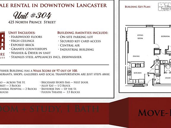 Call this upscale loft style 1 bedroom + study your home! This apartment boasts high ceilings, exposed brick and duct work, and original columns and beams for an industrial feel. Premium finishes include stainless steel appliances, full overlay shaker style cabinetry throughout the unit, unique light fixtures, and hardwood and ceramic tile flooring. An open floor plan and large windows flood natural light throughout the space. Closet space is plentiful and the apartment comes with a washer and dryer for your ultimate convenience. Impossible to find off-street parking is also included with your unit! Use of new outside patio space furnished with tables and chairs is now another amenity to this award winning, historic building. When you're not hanging out in your light-filled unit, venture outside into the heart of downtown Lancaster. With a walk-ability rating of 97% you are across the street from several of Lancaster's finest restaurants, cafes, and shops. There is no better location in Lancaster City - blocks from Central Market, bustling nightlife, the Fulton Theater, Lancaster General Hospital, and Franklin & Marshall College. Get out of town via Lancaster's Amtrak station (within walking distance) and head to Philadelphia, Washington D.C. or New York City for the day! Included in the rent is water, sewer, trash and on site parking. One year automatic renewing lease.