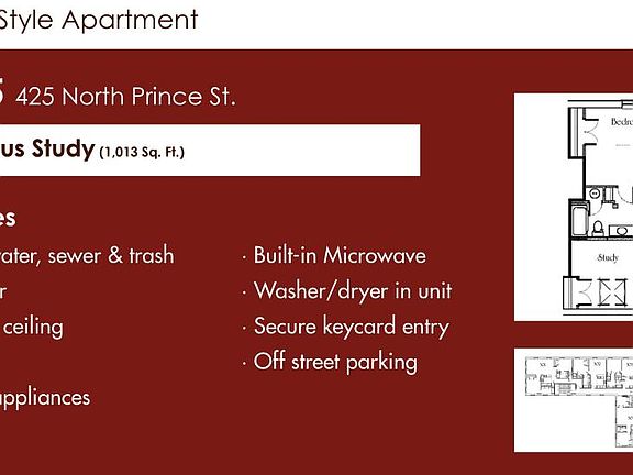 I Bedroom + Study - Upscale loft style apartment with original wood floors, stainless steel appliances, exposed brick walls and ceramic tile. Unit has 1 bedroom, 1 bathroom plus a study. Walking distance to restaurants and close to Central Market, Amtrak and Lancaster General Hospital.