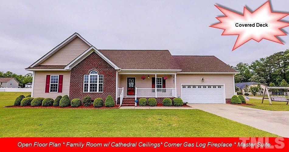 3BR/2Ba on Over Half an Acre Corner Lot in Goldsboro* Finished 2 Car Garage* Open Floor Plan* Large Family Room w/ Cathedral Ceilings and Corner Gas Log Fireplace* Bright Breakfast Area* Kitchen features Tile Back Splash, Breakfast Bar, White Appliances* Master Suite w/ Tray Ceiling, Walk in Closet, Tiled Walk in Shower* Covered Deck w/ Ceiling Fan overlooks Open Back Yard* Close to I 795 and US 70*