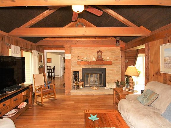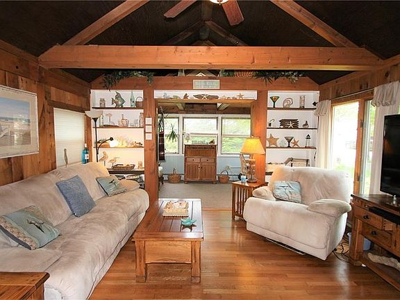 Welcome to beautiful Summerville! Enjoy summer living with sights & sounds of Irondequoit's beach and waterfront. This Ranch is more spacious than it appears and has a contemporary touches w/vaulted ceilings, wood beams,skylights. Cozy Adirondack feel with nat wood trim and paneling throughout. Liv rm has a wood burning fireplace w/stone hearth, built-in shelving. Den/office plus 3 season room. Formal dining area/sun room w/slider to gardens. Master bedrm has vaulted ceiling w/skylights, double closet. Unique double lot offers tons of privacy and has beautifully landscaped gardens. "Tree house" balcony over the carport/patio area. Double wide driveway, tear-off roof 2009, vinyl siding, large shed. Walk to the sandy beach or enjoy nearby parks, golf,walking trails and restaurants.