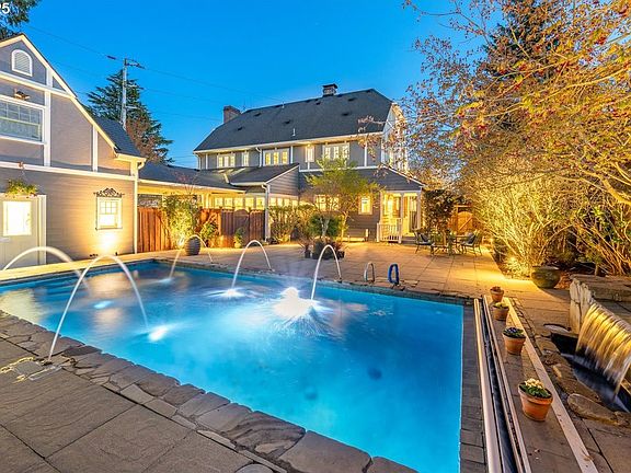 Welcome to this spectacular Tudor home in the desirable Mt Tabor neighborhood. This residence marries classic elegance with modern sophistication. Step into a world of luxury through an oversized front door, where you'll be greeted by breathtaking Honduran Mahogany & Quarter Sawn Oak millwork, custom built-ins, hardwood floors and newer double pane wood windows. The grand living room features a large fireplace, picture & crown molding. On the other side of the formal entry is the spacious dining room complete with plate molding, a bay window and built ins. The remodeled chef's kitchen features granite countertops, a double oven, 6-burner gas cook-top, fabulous island and loads of cabinet/pantry space - it is a culinary dream. Out the kitchen window and past the lovely landscaping you will see the fabulous custom pool complete with infinity hot tub – summer entertaining just went to a whole new level! Back inside, the elegance continues as you explore the primary ensuite, complete with a fireplace adorned with Ernest Batchelder tile, original built-in make-up table & 2 walk-in closets. Unwind in the beautifully designed primary bathroom featuring a soaking tub & walk-in shower. There are 2 other spacious bedrooms and a full bathroom on the 2nd floor, but that’s not all, head up to the top floor to find a sitting area or office, another full bath, and a large bedroom – a perfect guest quarters. Descend to the lower level to discover a family room with polished concrete floors and a fireplace. This level also includes a large laundry room, utility room and tons of storage space. Plus, there is carport that leads to a 2-story, 2-Car garage/Pool house with another a full bath and a changing room. The upper level of the garage could be an office or perhaps has ADU potential? Don't miss this rare opportunity to own a dream home located perfectly between coveted Laurelhurst & Mt. Tabor Parks! [Home Energy Score = 1. HES Report at https://rpt.greenbuildingregistry.com/hes/OR10237093]