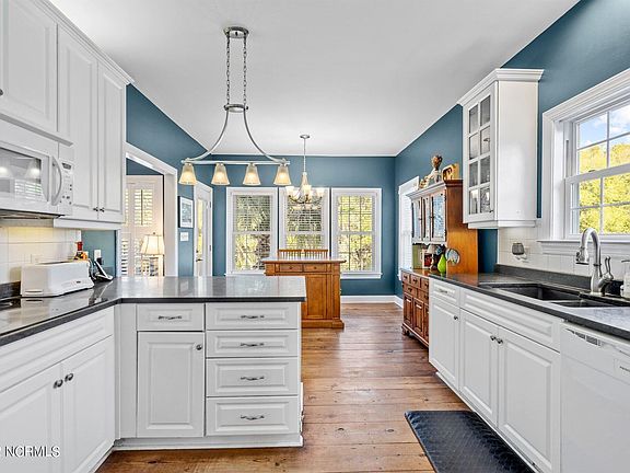 Ready to live the island life? Coastal life can be yours in this remarkable beach home conveniently located in a lovely Kure Beach community only a short stroll to the shore. Located on .16 acres, this 2,567 square-foot, 4 bedroom, plus large flex room and office, 4.5 bathroom home radiates a luxury coastal lifestyle with its large rocking chair front porch, 8' antique Georgia Pine floors, two-story ceilings in the sun soaked living room, and premium features throughout. The premier kitchen highlights granite counters, dual sinks, and a double-oven. Walk through double doors from the foyer into the formal dining room which conveniently connects to the kitchen or enjoy a casual meal in the breakfast nook. Your master suite boasts a large walk-in closet, en suite bathroom with linen closet, dual vanities, soaking tub, walk-in shower, and private access to the back porch. This property backs up to federal wooded land, so rest easy knowing nobody can ever build behind you. You'll get to enjoy afternoons with friends and family in the privacy of your back deck overlooking your backyard. Upstairs, you'll find three spacious bedrooms, one with an ensuite bathroom, another full bathroom off the hallway, and a large room perfect as an office or playroom. The ground floor includes an oversized room which could be used as an at-home gym, extra office, playroom, or flex space, the fourth full bathroom, a two-car garage, and a golf-cart garage perfect for housing your golf cart, beach toys, and kayaks. This home has space for all your needs! Additional features include central vacuum, an outdoor shower, built-in irrigation, new roof in 2022, and recoated vinyl (2019) with a 20-year warranty. In addition to this stunning house, you'll fall in love with the community amenities! Two swimming pools, tennis courts, two clubhouses, a beachfront gazebo and parking, and fitness center for only $375/year. Make your beach home dreams come true, call today to make this gorgeous home yours!