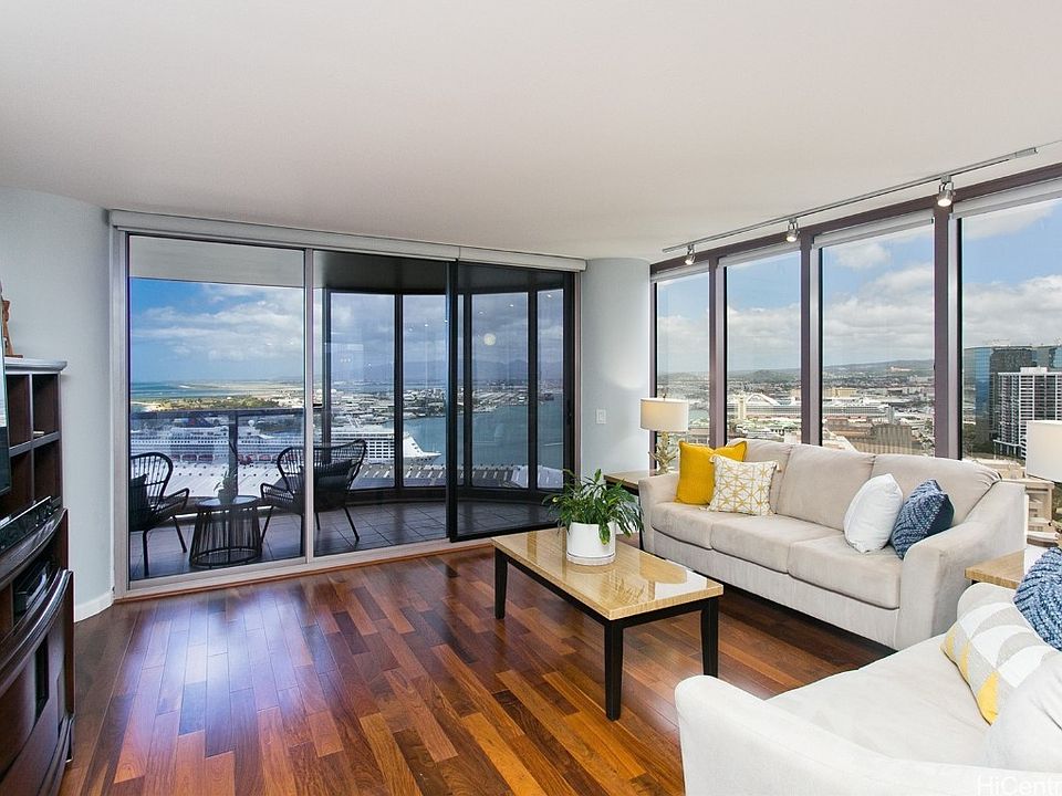 Completely remodeled, high floor, corner end unit with breathtaking 180 degree views of the Pacific Ocean, Downtown Honolulu, and Nuuanu Valley. Tastefully upgraded in 2016 and 2019 with hardwood floors throughout, spa-like bathroom oasis, additional storage, and a gourmet kitchen with Kitchenaid appliances. Extremely spacious floor plan with over 1400 square feet of living space, an en-suite primary bedroom, guest quarters or office space, and open-concept living and dining room. Imagine hosting a sunset pau hana on your oversized lanai with unobstructed views of the entire South Shore. Central AC and remote controlled blinds for comfortable temperatures all day. Two covered parking stalls and guest parking in the building, with all the excitement and amenities of Kakaako within close distance. VA ASSUMABLE LOAN available to qualified buyers at 2.25%. One Waterfront Towers received the IREM Building of the Year Award for buildings over 250 units built before 1993… No surprise, as residents can enjoy the pool, hot tub, rec deck, gazebos, bbq areas, game room, multiple gyms, tennis courts, and have 24 hr security on site. This turn-key home might be the perfect match for you.