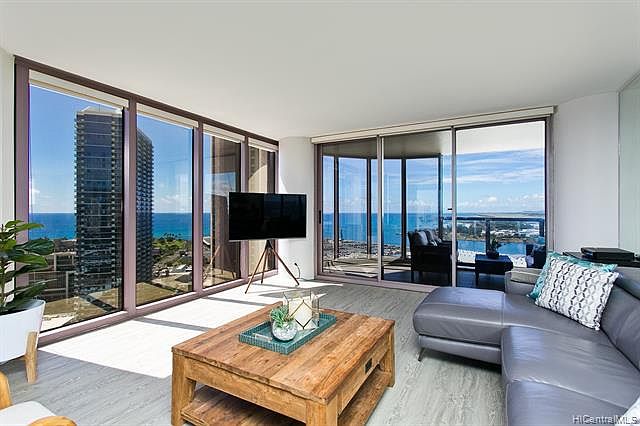 Beautifully renovated 2BD/2BA/2PKNG corner-end unit with panorama views spanning from Diamond Head to Ewa and everything in between. Walls of floor-to-ceiling windows ensure you enjoy ocean, mountain, city, sunrise & sunset views from inside the unit. Fabulous open floorplan w/ spacious kitchen & huge covered lanai. The master suite has its own access to the lanai, big walk-in closet & large en suite bath. Bright second bedroom is perfect for a home office. Recent upgrades include smooth ceilings & lovely vinyl floors. Plantation shutters & window shades installed. Central AC. Preferred quieter location in Mauka Tower. One Waterfront Towers is a secured & pet-friendly building. Amenities include 24hr security, guest parking, pool, tennis courts, rec area, gym & more! Convenient Kakaako location and close to Downtown, major roads and freeway for easy commute. The SALT complex, Waikiki, Ala Moana, restaurants, shopping, grocery stores, beaches, parks, etc are all just a few minutes away.