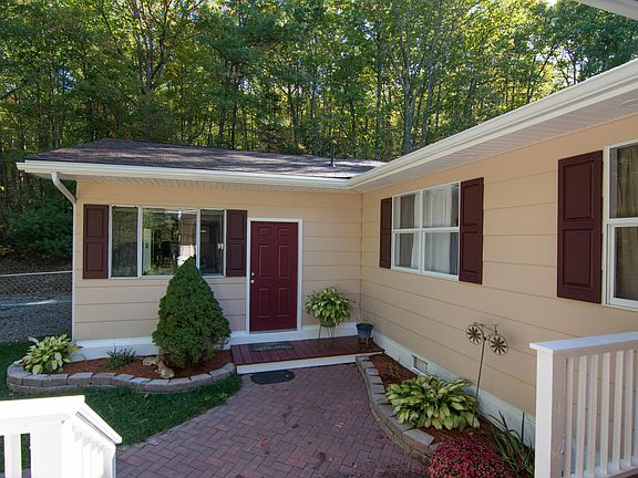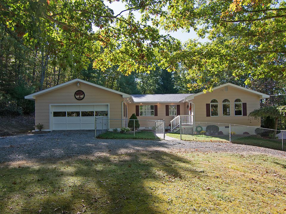 Tranquility and quietness awaits you at 425 Todd Lane. Surrounded by woods and wildlife, situate on 3.9 acres and is as inviting as a warm hug on a chilly fall day. This one level rancher features an open living and dining area with several windows and French doors that open up onto the wrap-around porch allowing for light to abound through the home abundantly. The newly remodeled, eye-appealing kitchen is sure to make you consider making this your happy place. The kitchen features black appliances to complement the new oak, classic gray stained cabinets finished with earth toned counters, colorful and custom, arched, stained glass window valances, stacked stone back splash, spice rack and custom prep table. There is an eat-in kitchen and bar area with pendant lighting for added charm...