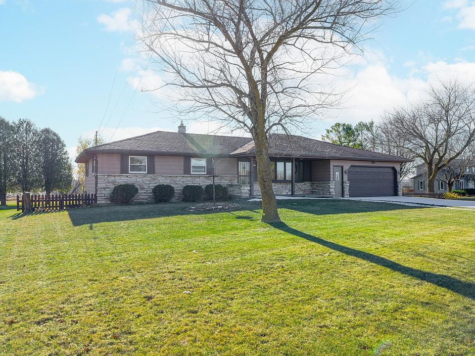 ENJOY PUBLIC WATER & SEWER, walkout ranch w/extra garage & a total of 1.7 ACRES in the village limits...WOW! Become the new owner & bring your ideas & toolbox to convert this into a equity building opportunity! Main floor features a super-sized living room w/bow window, spacious dining w/big window overlooking the endless country views & nature at your back door! Off the kitchen area is a large closet, full bath w/shower & a 10x5 rm that can be a small 4th bedroom, home office or 1st floor laundry?! Also 3 spacious BRs & a full bath w/large vanity finish the main level tour. LL has a rec rm & half bath w/block walls. Needs new flooring in LL. Updates: painting & carpeting 1st floor, Roof '14; Furnace '22; Home warranty incl. 48 hr bind no bind on wked/holdy. Being sold in AS-IS cond.