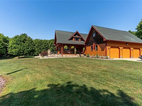 This thoughtfully built home provides aesthetics & functionality for any lifestyle. The long private driveway leads you to a resort-like home situated on 31 acres. Upon entering you'll find that timeless warm oak accents are abundant throughout. The kitchen offers granite countertops, solid oak cabinetry & brushed bronze finishes. A sun drenched living room hosts a gorgeous 2 sided stone fireplace & vault ceilings. The 1st floor is complete w/ an office or 4th bedroom, laundry room, 1/2 bathroom, mud room & 3 car attached garage. The master bedroom provides his/her closets, en suite bathroom, vault ceiling & a picturesque view. The 2nd & 3rd bedrooms provide custom built in desks & walk in closets. The basement provides a gym area, game room, wet bar, kitchen, fireplace, full bathroom & storage. To complete this Western Pennsylvanian paradise; the backyard is absolutely perfect for parties. An oversized patio leads you to a stone fire pit & an inground pool w/ water slide & tiki bar.