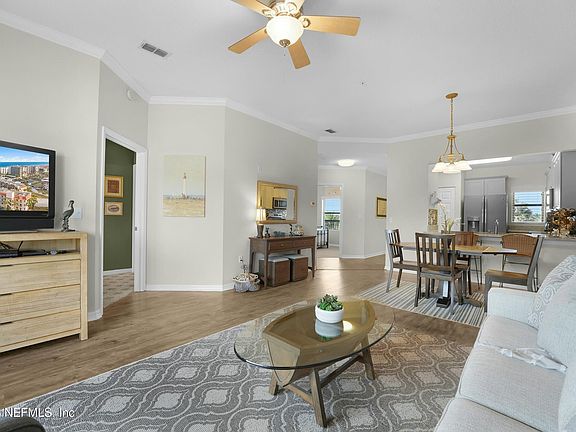 Welcome to the beautiful white sand beaches and ocean breezes of Ocean Village Club, a gated oceanfront condo community with great amenities - clubhouse, two sparkling swimming pools, tennis courts, shuffleboard courts, a picnic area with grills, and a private beach access walkway. At Ocean Village Club, you're just steps away from the ocean, and within walking and biking distance of restaurants, shops, and entertainment. The countless sights of historic downtown St Augustine are just a quick 15-minute drive up A1A. Whether you're looking for home, a short-term rental investment, or a second home to escape it all, this just might be the one! This beautifully updated third floor condo offers peek-a-boo views of the ocean through the palms and is conveniently located near the building's elevator. As you enter the unit, you'll notice the tastefully updated kitchen with solid wood soft close cabinets, granite countertops, tiled backsplash, and stainless-steel appliances. Kitchen also offers a pantry closet and a laundry closet with stackable washer and dryer. Beyond the entryway and kitchen, the dining and living area offers crown molding and LVP flooring. Just off the living room is the slider to the balcony - the perfect place to enjoy the ocean breeze and your favorite beverage. A split-bedroom floorplan offers added privacy, with spacious bedrooms, large closets, and ceiling fans. The primary bedroom offers double closets and ensuite bath with walk-in shower. This unit has been lovingly maintained by the original owner and has only been enjoyed by family and dear friends - never used as a rental. Short term rentals are permitted, however, and condo is being offered fully furnished with all household needs in place at time of showing. With a king-sized bed in the primary bedroom, a queen in the second bedroom, and a sofa bed in the living room, unit can comfortably sleep six. If a short-term rental is your goal, Ocean Village Club offers on-site property management and maintenance, allowing you to sit back and enjoy your investment. Or if you plan to keep it all to yourself, Summerhouse is also a great place to call home or escape from it all anytime you'd like. Rental projections are available upon request. This unit is truly special and a must see! Don't let it be the one that got away - book your showing today to see it in person, and let's make this one yours!