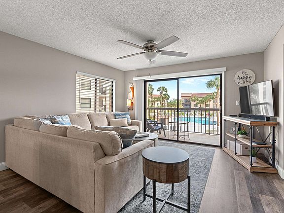 Enjoy the beach life in this beautifully updated and fully furnished second-floor condo just steps from the sand in the popular gated community of Ocean Village Club. Renovated with care and high-quality finishes, this move-in ready home features luxury vinyl plank flooring throughout and a thoughtfully designed kitchen with quartz countertops, modern cabinetry, under-cabinet lighting, stylish backsplash, stainless steel appliances including an induction range, and a stack washer-dryer. The spacious split-bedroom layout offers refreshed bedrooms, while both bathrooms showcase newly tiled showers, raised vanities, and timeless finishes. Relax in the inviting living area or step out to the covered lanai with views of the heated pool. Ocean Village Club stands apart from other beachside communities with its expansive grounds, abundant green space, ample parking, and generous distance between buildings which are rare finds this close to the ocean. Residents enjoy resort-style amenities including two pools (one oceanfront), tennis courts, shuffleboard, fitness center, picnic/grill areas, and private beach access. Monthly fees include cable, Wi-Fi, landline with U.S./Canada calling, water, and sewer. Additional upgrades include a newer AC installed March 2024, full repipe, and paid reserves through 2029 saving $2,250 for the buyer. Ideal as a beach home, second home, or vacation rental, with a prime location near restaurants, shopping, and just minutes to historic downtown St. Augustine. This is coastal living at its best!