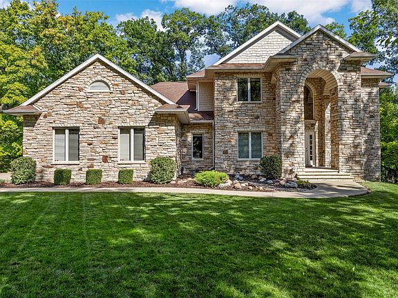 Absolute perfection in every way!!! Situated on a 1.49 acre wooded lot, this quility-built home includes an impressive 2 story entry and open staircase, custom wood floors throughout the entire main floor, main floor study with built-ins and fireplace, living room with fireplace, a wall of floor to ceiling windows w/ views of nature in all directions, the immpressive kitchen includes double ovens, pantry, granite counters, spacious breakfast nook and all open to the family room with a dramatic vaulted ceiling and more custom built-ins and fireplace, main floor laundry and spacious 3 stall garage. The walkout lower level includes a beautiful family room with built-ins and fireplace, pool table area, full gym, 4th bedroom and full bath. The 2nd floor includes a spacious primary bedroom, remodeled bath plus huge walk-in-closet, bedroom 2and 3 share a remodeled Jack & Jill bath. This home is maticulous both inside and outside. The exterior features a full limestone front and concrete siding in the rear, newer maintainance free decking and rail. You will love privacy and peaceful surroundings!!