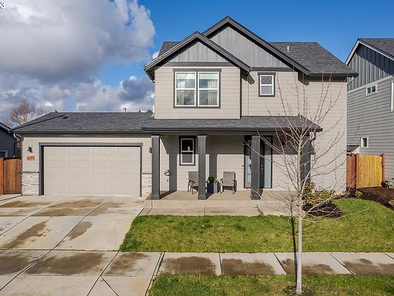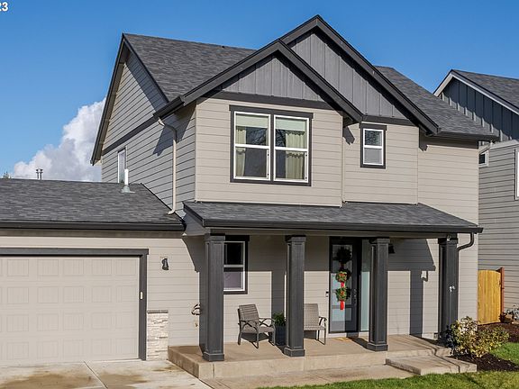 This like-new, quality-built Bruce Wiechert featuring 3 spacious bedrooms and 2.5 bathrooms will be sure to delight even the pickiest of buyers. Built in 2020 with high-end finishes including 9-foot ceilings, luxury vinyl plank flooring, quartz counters & modern shaker cabinets w/ soft close feature throughout, stainless appliances, pantry w/ pullouts, tile backsplash in kitchen, tile floors in the bathrooms, gas furnace, central A/C, Hardie plank lap siding in front & back, and finished garage w/ pull-down ladder for attic storage. This immaculately maintained home has also benefited from many custom upgrades including designer window shades, all new modern lighting, 2 ceiling fans, upgraded bathroom mirrors, brand new washer/dryer, and security features like motion sensor lights, 3 wyze cameras and simplisafe system. Downstairs you will find the open-concept great room featuring a gas fireplace, large picture window, generously sized dining area, gourmet kitchen, utility room and powder room. The light-filled staircase leads to the vaulted primary bedroom ensuite with 11x8 walk-in closet, attached bath w/ walk-in shower and dual sinks plus 2 more bedrooms, hall bathroom w/ soaking tub + plenty of storage. The fully fenced yard is easy to maintain and extremely private with no back neighbors and has underground sprinklers, a covered back patio, covered front porch with stylish glass door, and 4 specialty garden beds made from a porous concrete. Even with all of these amazing features, the owners' favorite part of the home is that it is less than 1 mile to Clearwater Park on the river and the Middle Fork of the Willamette Path trail system....they love riding bikes down thru Dorris Ranch and to downtown Springfield.