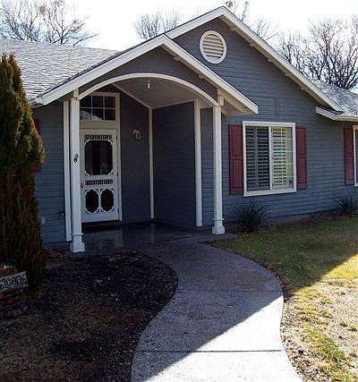 Reminiscent of New England or Midwest country style, single-level home. Master bedroom suite with access to private patio. Plantation shutters. Split floor plan for separate guest bedroom. 3rd bedroom is set up as office with built-in desk and shelves. View the fire in the living room high efficiency gas stove. Adjacent room could be dining room or studio but is currently used as sun room for reading. Daydream while looking out at the golf course and mountain views. Wonderful kitchen includes breakfast nook with bay window looking out to century old trees. Cooks will love gas range and pantry -- sink and dishwasher in island. Exceptional 1/3 acre lot with fully fenced back yard for your dogs. Very easy parking of your RV.