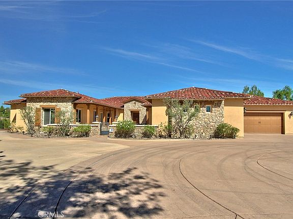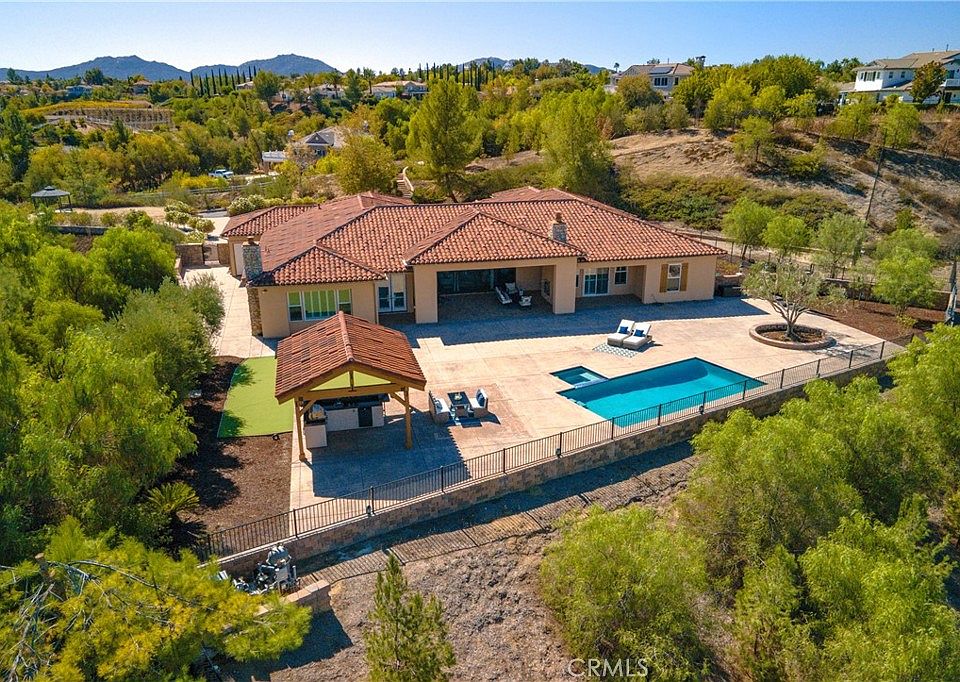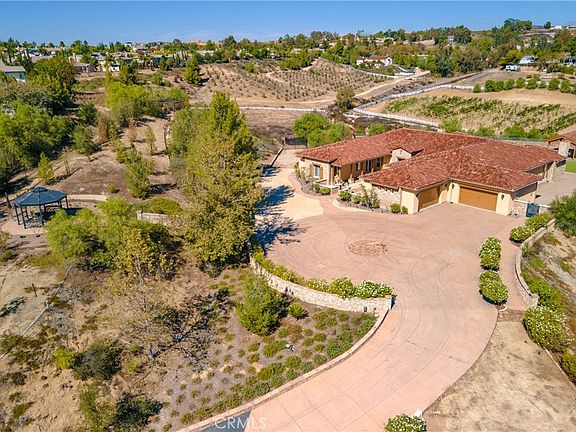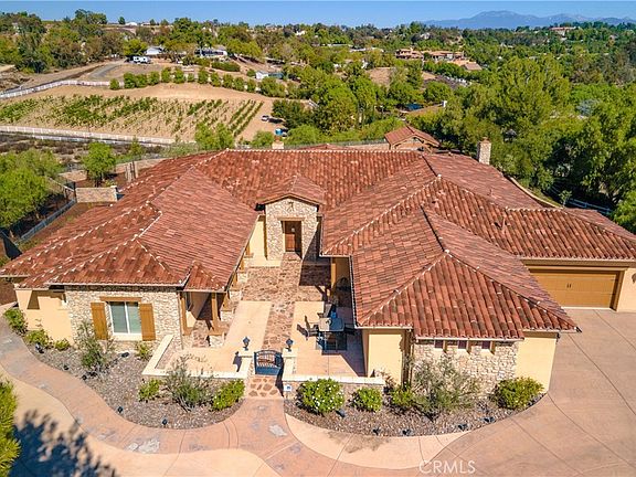 Stunning Tuscan Estate in Gated Crownhill Reserve – Over 7 Acres of Private Luxury Living. Welcome to your dream home in the prestigious gated community of Crownhill Reserve. A resort-style, single-story Tuscan estate offering privacy, elegance, and room to grow. Situated on over 7 meticulously landscaped acres, this 4,981 sq ft masterpiece boasts 4 bedrooms, 4.5 bathrooms, 2 home offices, and a spacious 4-car garage. This home boasts exceptional outdoor living. Enter through your own private gated entrance into a serene retreat surrounded by lush, manicured grounds. Enjoy stunning panoramic views with no neighbors behind, offering ultimate privacy. The backyard is an entertainer’s paradise featuring a sparkling pool & spa, covered cabana, outdoor kitchen & BBQ, fireplace, low-voltage landscape lighting, and a putting green. There’s ample space for a vineyard, horse facilities, guest house, or garden oasis—endless possibilities await. Step inside to a grand, light-filled living room with 12-foot ceilings and a 20-foot disappearing pocket door that seamlessly blends indoor and outdoor living. The spacious dining area includes a dedicated wine nook, perfect for entertaining. The gourmet kitchen is a chef’s dream, featuring granite countertops, bar seating, a large center island, built-in refrigerator, Wolf cooktop, double ovens, and a huge walk-in pantry. It flows effortlessly into the cozy family room with a second fireplace and casual dining space. The home is adorned with engineered hardwood flooring, tile in wet areas, shutters on all windows, neutral tones, 5” baseboards, and soaring 10–12-foot ceilings throughout. The primary suite is a private retreat with its own sitting area, backyard access, and a newly designed walk-in closet. The elegant primary bath features a large soaking tub, oversized shower, dual vanities, quartz countertops, and a makeup station. Each of the three additional bedrooms offers en-suite bathrooms and walk-in closets, with enough space to accommodate king-size beds. The laundry room includes upper/lower cabinetry and a sink for added convenience. Enjoy the peace and quiet of country living with the convenience of city access—just minutes from Temecula’s world-famous wineries, top-rated schools, shopping, and freeway. Don't miss the virtual tour to fully appreciate everything this remarkable home has to offer. This is more than a home—it's a lifestyle.