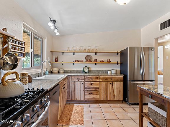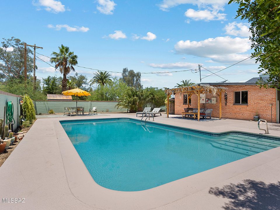 This attractive, well cared for home is located in the highly-desirable Poet's Corner neighborhood in Central Tucson. Sitting on a corner lot, you enjoy views of the Catalina and Rincon mountain ranges. The home features cool tiled floor throughout, open great room, newly remodeled kitchen with hickory cabinets and soft-pull drawers, terrazzo countertops, all SS appliances, and abundant natural light through home. Owned solar panels and rainwater tanks. The principal bedroom with en-suite bath has access out to the diving pool, 55-foot covered patio, and poolside pergola for comfortable outdoor living and entertaining. Surrounded by mature trees, desert landscaping, RV parking, covered carport, and includes a backyard site for a casita to build if you desire.