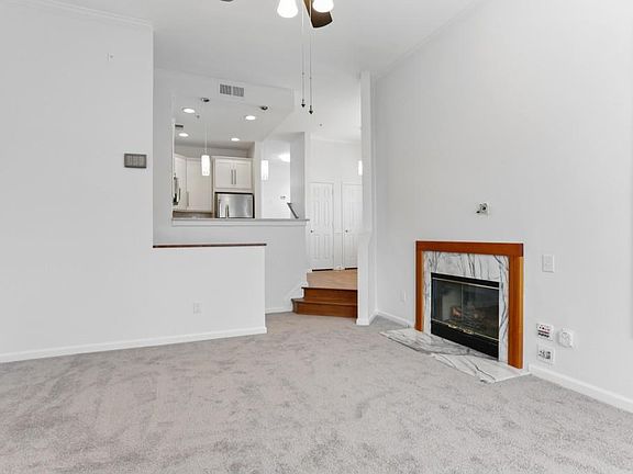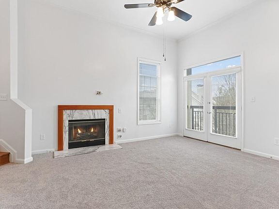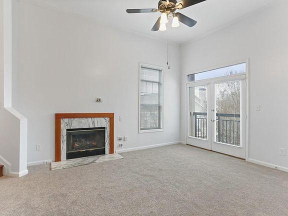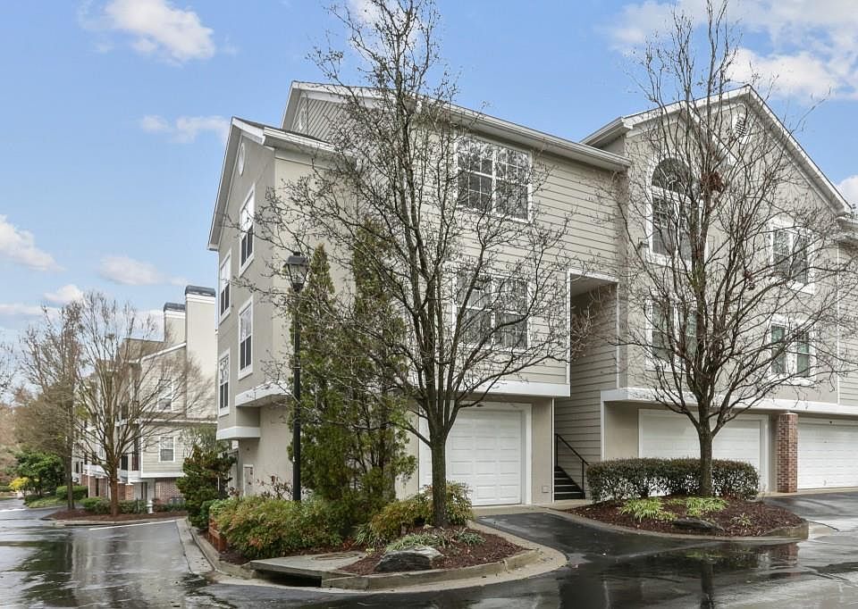 Stylish renovated end unit townhome with garage in gated River West backs up to a green area affording privacy and views. This light filled unit is renovated with on trend colors and open floor plan appealing to today's buyers. The spacious great room with 10'+ ceiling height has multiple windows, gas fireplace, new carpeting and French doors to balcony. The beautiful kitchen with view to great room has white shaker style cabinetry, quartz counters, stainless appliances (refrigerator, dishwasher, mw, gas range, two ovens). The dining area is surrounded by windows. There are two pantry closets. The flex room is charming with built in desk and shelving perfect for an office or den. The large bedroom has a huge window and a custom walk in closet. There are hardwoods in the kitchen, dining rm, bedroom and flex room. The gorgeous renovated bath has marble floors, the large glass enclosure marble shower with niche, new vanity with solid surface counter and linen closet. The laundry room is located on the upper floor and includes stacked W/D unit and built in shelving. Need more storage? The garage has plenty with shelving units lining two walls.This popular gated community has an updated and nicely appointed clubhouse with fitness room and business center, two pools and dog park. River West is located in a convenient location offering access to the river, walking and running trails, private and public schools, restaurants, shopping, highways and the Braves stadium. Well run and funded complex. Exteriors were painted in 2018.