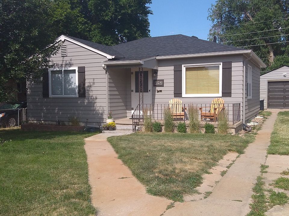 Absolutely charming! Great curb appeal with a huge producing cherry tree in front and a cozy front porch*Plus a completely remodeled interior*Mid century charm*Coved ceilings*Arched doorways*Big picture window*Modern farmhouse chic kitchen w/new cabinetry*Tiled floor*Apron sink*Gas stove*Stainless appl.*Concrete countertop*Custom built hood*Floating shelves*Refinished original hardwoods*Bsmt fully finished w/shiplap*Eucalyptus floors*Wet bar*Wine cooler*New egress window*Conforming Br*3/4 bath*LED lighting*New light fixtures*New evaporative cooling system* 26x15 covered paver patio w/gas fire pit*Sprinkler and drip system front and back*1 car det. gar. w/xtra parking alley side*New paint in and out*Vinyl windows*New 200 amp panel *4 year new hail resistant roof*Only six blocks to Jason Park! Convenient to Englewood Rec Center, Oxford Station light Rail, restaurants, especially the ever important Starbucks and the Barnhouse Tap Brewery. Great place to live! Convenient to so much!
