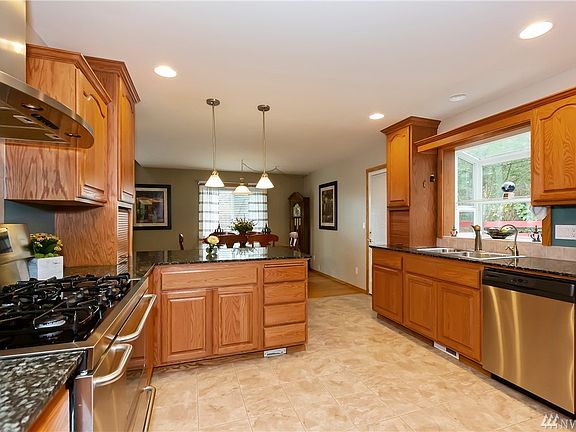 Lives like a rambler - Beautiful open floor plan w/vaulted ceilings, skylights, fireplace in the great room. Red oak hardwood floors throughout. Master bed w/french doors to patio w/walk-in shower, jetted tub and walk-in closet. Upstairs the bedrooms have the largest closets you'll see + bonus storage area. Exposed aggregate surrounds the home w/power for hot tub. Finished detached garage has propane heat, hot water & 30 amp service PLUS RV parking w/30 amp service, dump & water
