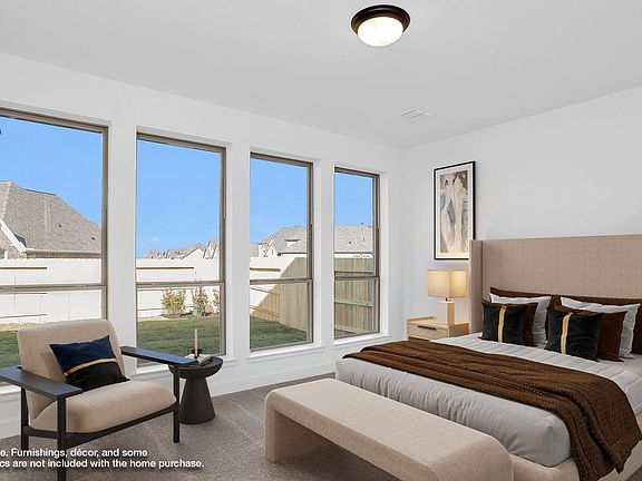 READY FOR MOVE-IN! The front porch leads to the main entryway with a 11-foot ceiling. French doors open into a private home office. The utility room is conveniently located off the main living areas. A welcoming kitchen features an island with built-in seating and a 5-burner gas cooktop. The dining area boasts ample natural light. The two-story family room features a wall of windows and access to the covered backyard patio. The primary bedroom, located off the living areas, includes dual vanities, a garden tub, a glass enclosed shower, and large walk-in closet. A private guest suite with full bathroom located off the kitchen. Upstairs you are greeted by a game room. Completing the upstairs are the secondary bedrooms, featuring walk-in closets and a shared bathroom. The mud room is located off the two-car garage.