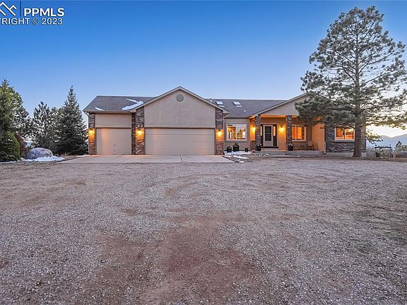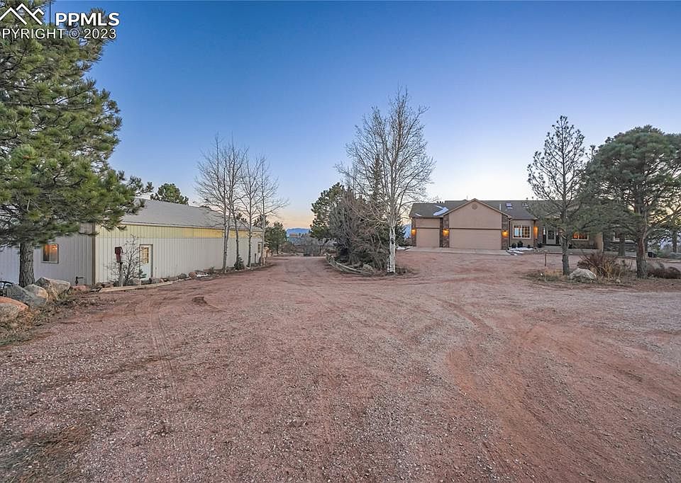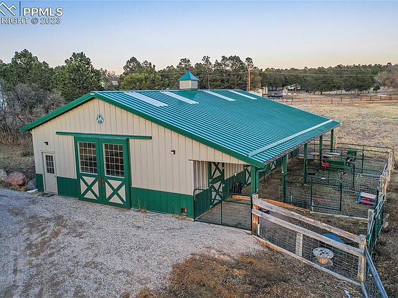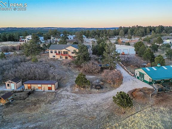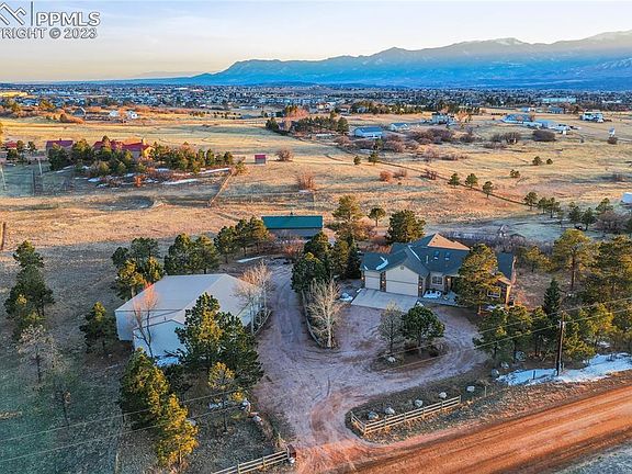 This property has it all! The most sought after and desirable location in Western Black Forest w/ 5 treed and meadow acres, tremendous Pikes Peak and front range views, a custom built 4,000+ rancher w/ walk-out basement, a 3,100+ sq ft RV garage w/ heated workshop, 1,400+ sq ft barn w/ 4 stalls, a second 4 stall barn. The best of both worlds living on beautiful close-in acreage at the edge of the city w/ convenient access to everything you need. Beautifully remodeled home. High end kitchen remodel w/ high quality cabinetry, a very rare and gorgeous slab granite with copper veins, stone backsplash, under cabinet lighting, massive entertaining island, 2 sinks, copper farmhouse sink, high end Miele appliances, a built-in espresso maker, custom hood, commercial cabinetry paneled Miele refrigerator. New interior doors, hardware and trim throughout. Luxury vinyl floors. 5 bedrooms (3 on the main level), 4 baths, central A/C, 13 car garage. Jaw dropping views from all southwest facing windows and large deck. New oversized 4 panel sliding door system in dining room w/ double opening. New high end fireplace and stone surround in great room. Fully finished walk-out basement. No covenants or HOA. Huge RV garage workshop w/ electric, a heated and separate workshop, 3 large oversized overhead doors - room for RV's, boats and more! Two barns - one barn w/ 4 stalls, water, electric, hay storage, runs and room to add more stalls. Secondary 4 stall barn. Only minutes from Northgate, the Air Force Academy, Flying Horse Signature Golf Course. Close to Black Forest Regional Park. Quick access to Highway 83, Powers and I-25 making an easy commute to Colorado Springs or Denver. Award winning School District 20. Perfect mixture of Ponderosa Pines, Aspens, Scrub Oak and pasture. Fully fenced and gated acreage. Rarely does a property w/ this location, unbelievable views and amenities come on the market. Zones for horses and other animals. Matterport 360 Interactive Floor Plan Available.