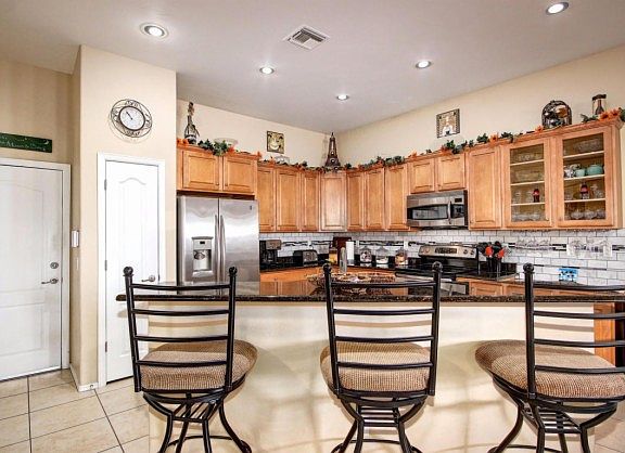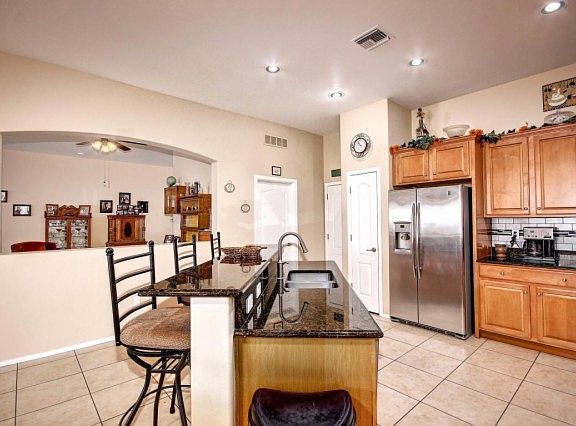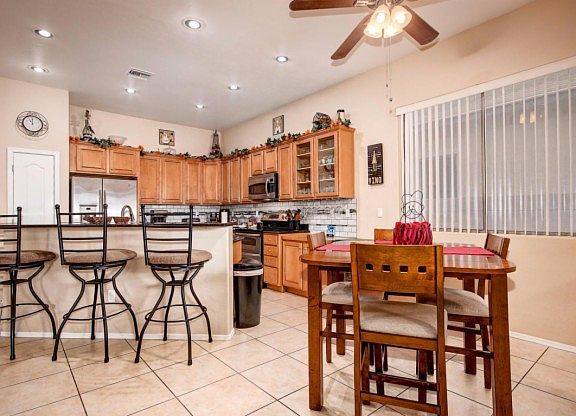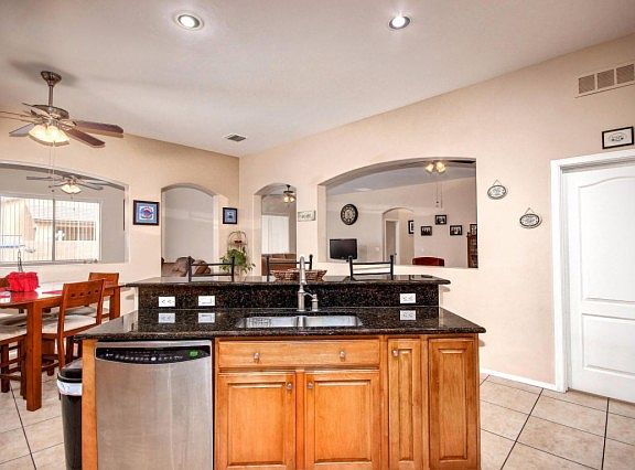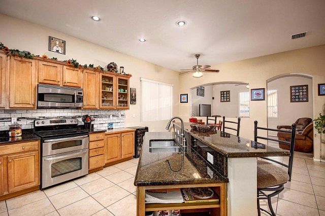 Outstanding single level Home on a large corner lot. 4 Bedrooms, 2 bathrooms, plus Den! Soothing interior palette, ceiling fans, plush neutral carpet, window blinds, & lots of natural light throughout. This spacious open floor plan features eat-in kitchen, granite counters, subway tile backsplash, center island, breakfast bar, SS appliances, pantry, tile floor, & plethora of upgraded wood cabinets with hardware. Perfect Home for entertaining inside & out! Grand master retreat boasts patio access, upscale private en suite, and walk-in closet. Enjoy the backyard covered paver patio, refreshing pool w/waterfall, and lush green foliage. Seller is a licensed real estate agent in the state of Arizona.