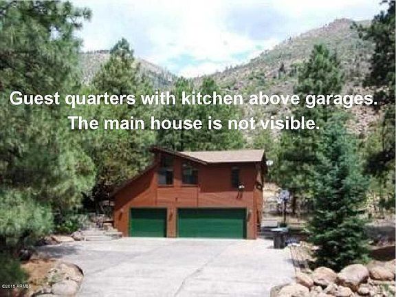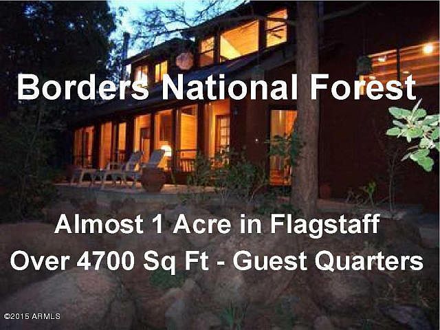 BORDERING NATIONAL FOREST in the City of Flagstaff, a lodge-style home with separate guest quarters. At the base of Mount Elden, and on a .94 acre lot (with a seasonal creek), sits this majestic lodge-style home. The current owner added additional guest quarters (with a full kitchen) above the 3 car garage. The main home is nestled in the pines, and not visible from the street. Enjoy nature at its best with national forest and miles of hiking trails directly behind this one-of-kind property! The main house has a massive dining room with open beams, breakfast bar and kitchen with newer counters, huge living room, family room, den, loft, sunroom with spa, master suite with fireplace, oak flooring, and 4 fireplaces, The West Wing of the house can be used as separate guest quarters.