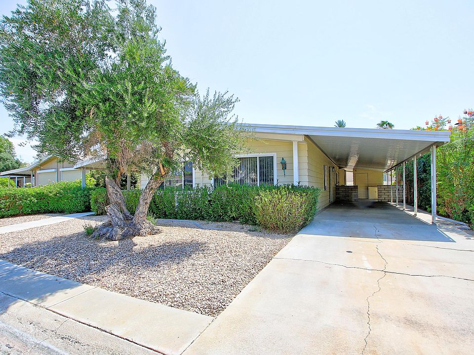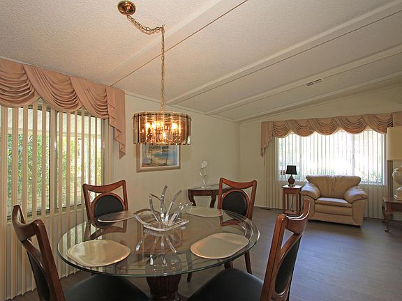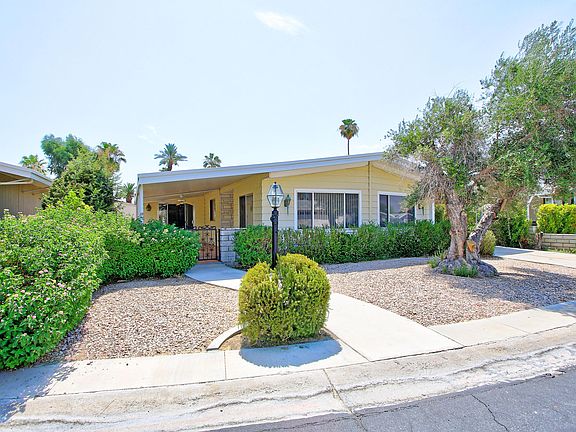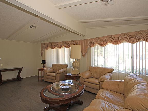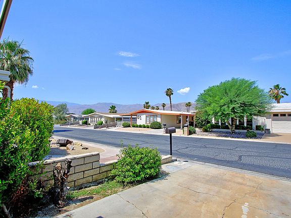 This home is an excellent value with a great floor plan, large living room and formal dining room also super kitchen. Manufactured Home sold with real property, home to remain. It is 1740 sq ft. with Laminate Flooring throughout, (except kitchen, bath, and utility.)Newer appliances & refrigerator, stove, and built in microwave, kitchen overlooking a great room with sit down wet bar. Spacious master suite and guest bedroom.. Roof new in 2004, and checked in 2020, A./C installed 2013, water Heater installed 2014. Foundation checked and maintained 2014. Patio that has clay tiles. A wonderful place to entertain and view the sunset and Mount San Jacinto. Located on a very private cul-de-sac this is a great buy! Still on the original tags that means great tax savings to a new Evaporative cooler 2005.
