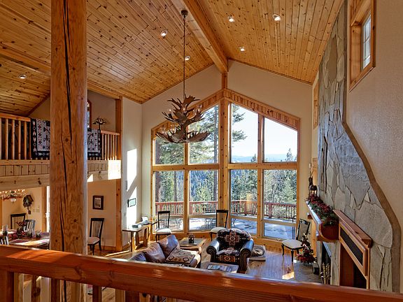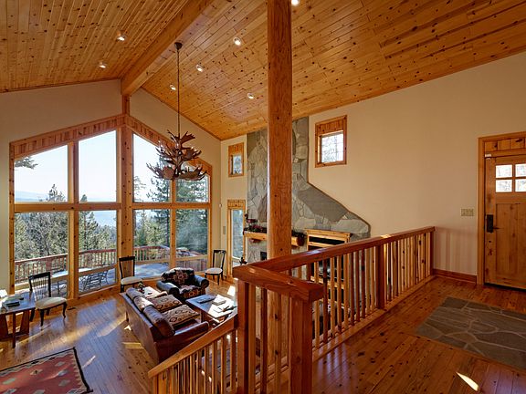 This home in Shaver Lake boosts hundreds of miles of unobstructed views of Bald Mtn, Mineral King Canyon, and the Saw Tooth Mtn range. The 3 bedrooms and 2.5 baths with a large loft allows for sleeping for 10+ people. The 20 ft high windows maximize the views, where the 25ft Green Rocky Mtn quartz and slate rock fireplace warms the entire home. The flooring is covered with exotic AUS Cypress wood, salvaged from an old tobacco plantation. The kitchen features Verde jade granite countertops w/ stainless steel GE profile appliances, and Bosch dishwasher. The mstr suite has 15 ft high ceilings, lrg walk in closet lines w/ red cedar flooring, and a luxurious mstr bathroom. The bathroom is covered in charlotte white and black speckled granite with dbl sinks, sunken Jacuzzi tub, and lrg granite shower. Outside the 1200sqft+ deck is great for entertaining. Easy level parking and access from the deck to some of the best hiking into the Forest this custom home is perfect f or relaxation.