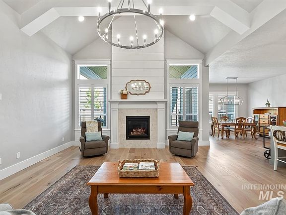 Better than new and loaded with upgrades! This stunning James Clyde home—built by one of the Treasure Valley’s local premier luxury builders, features new plantation shutters, water softener, water filtration system, tankless water heater, and added solar panels for energy efficiency. The open-concept offers soaring great room ceilings, family dining, a chef’s kitchen with 9' island, Thermador double ovens, 5-burner cooktop, micro-drawer, and refrigerator. A versatile den/office can serve as a guest bedroom. The primary suite includes a spa-like bath with a floating soaker tub, dual vanities, a zero-grade shower and a walk-in closet with direct laundry access. Two large bedrooms share an oversized Jack & Jill bath. Enjoy the east-facing backyard—ideal for entertaining or gardening. Exceptional storage throughout. Community amenities include a pool, playground, and walking paths. Easy access to shopping, dining, Costco & more. Located in an upscale, sought-after community offering both comfort and convenience.